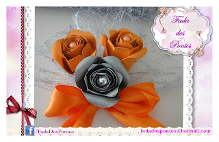 Rosas de papel laranja e cinza com pérolas no centro. Aplicação organza prateada com purpurinas, arame e pérolas, fita de cetim laranja, corda e pérolas.