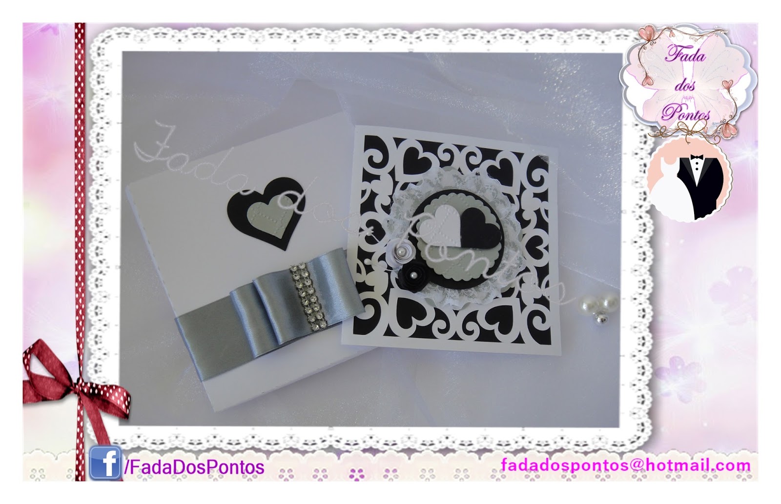 Envelope em cartolina com aplicação de fita/laço de cetim com strass e corações com relevo.