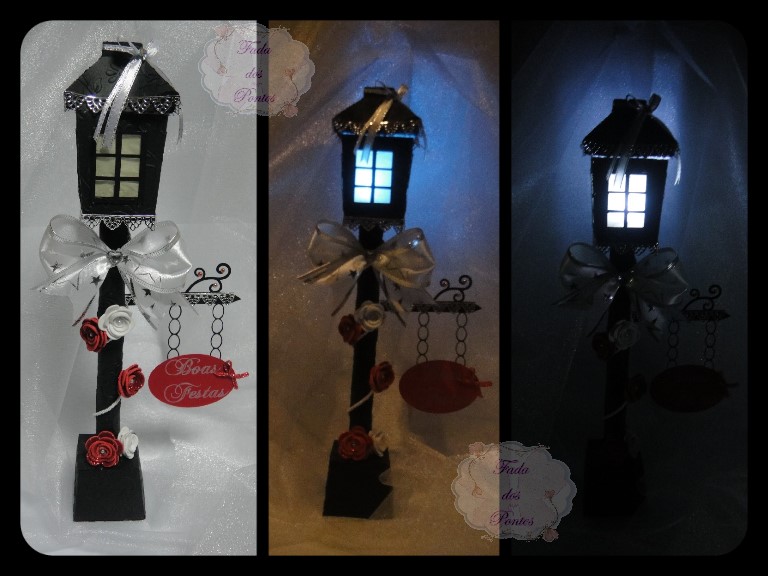 Candeeiro todo em cartolinas com aplicação de luz artificial na parte superior, decorações em papel brilhante, corda, rosas em Goma Eva (esponja), laços, brilhantes, placa a dizer "Boas Festas", etc.