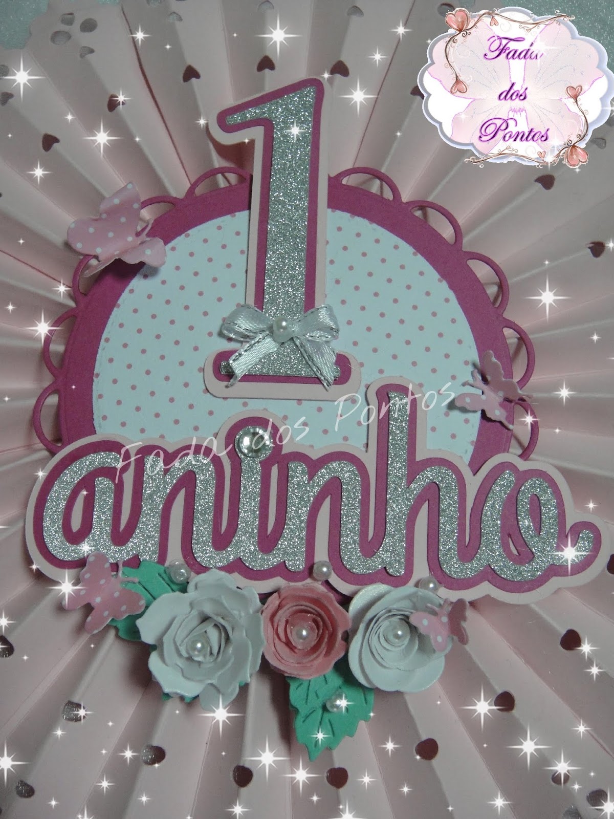 Roseta em cartolinas com aplicação de número e letras em camadas com cartolinas com glitter, rosinhas de papel feitas à mão com aplicação de perolazinha no interior e nas folhas, borboletas, etc.