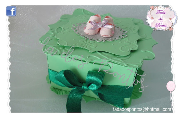 Caixinha em cartolina com aplicação de textura com pezinhos, tag com indicações do evento impressas a cores em papel autocolante, meias pérolas, fita de cetim e laço. Com organza dentro da caixa e sabonetes pezinhos (com essência de talco ou frutos do bosque) envoltos em papel transparente (para não ressoarem) e com organza e fita.