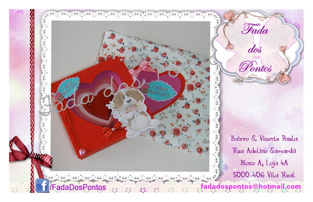 Cartão todo em cartolinas com formato de corações com variadas camadas e cores. Com aplicação de cãozinho, cupcake, laço, fita, metade de coração e meias pérolas, com dedicatória atrás.