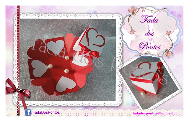 Caixinha em papel (cartolinas) com aplicação de fita, laço e meia pérola. Ao retirar a tampa da caixa esta abre e pode conter ainda recadinhos ou palavras escritas nos corações.
